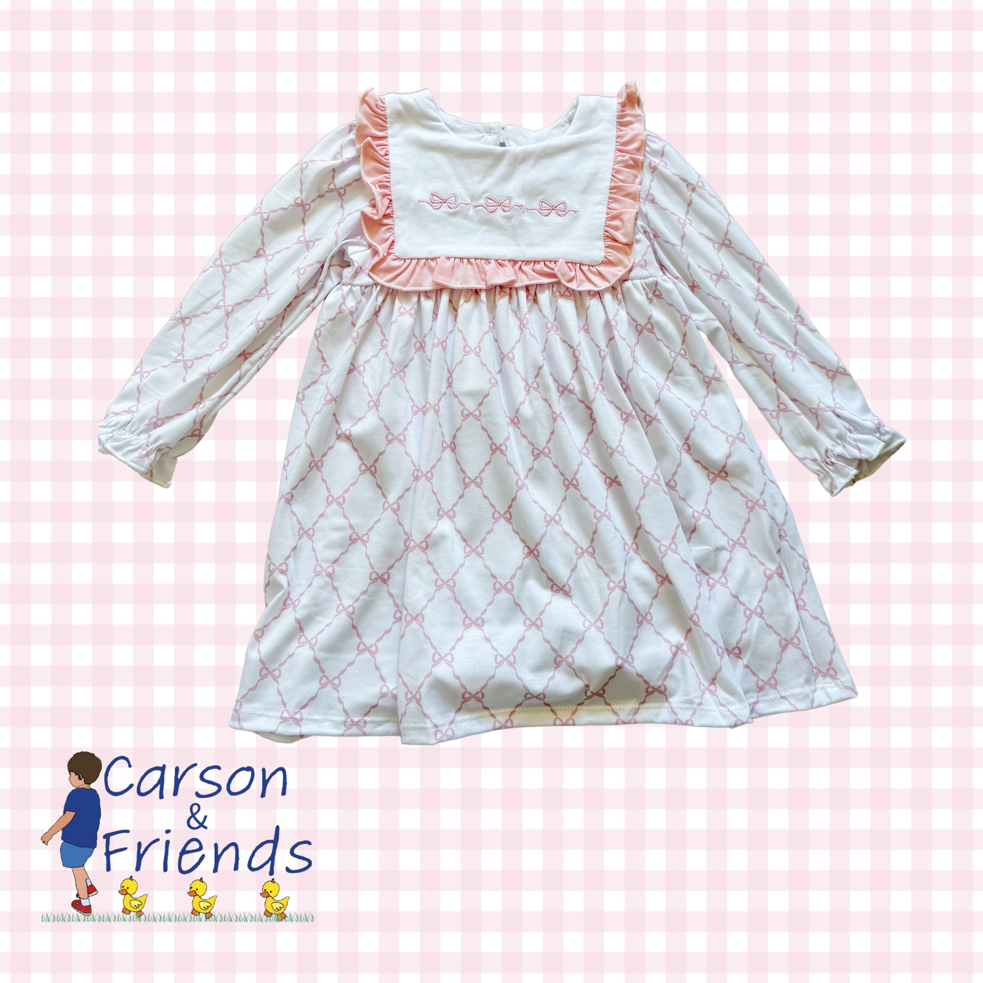 Dress your little one in the Carson and Friends Bow Trellis Dress, beautifully crafted from knit material. This kids' dress is a charming representation of Carson & Friends' signature Southern flare. Known for our smocked, embroidered, and bamboo clothing, this dress is a delightful addition to any child's collection.